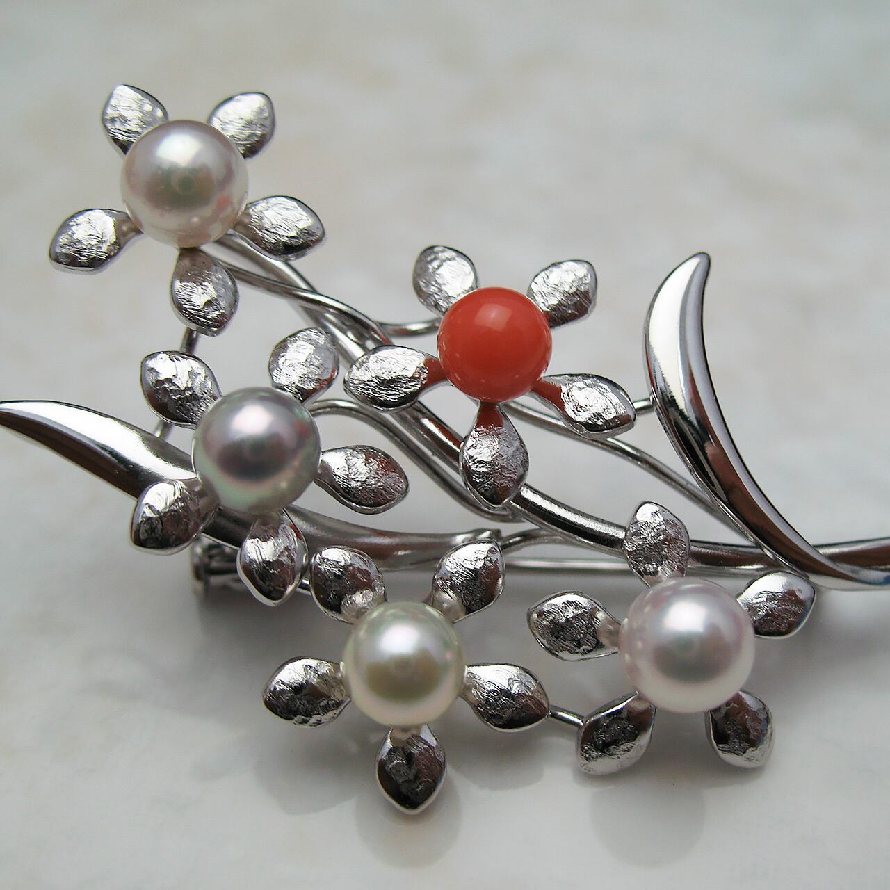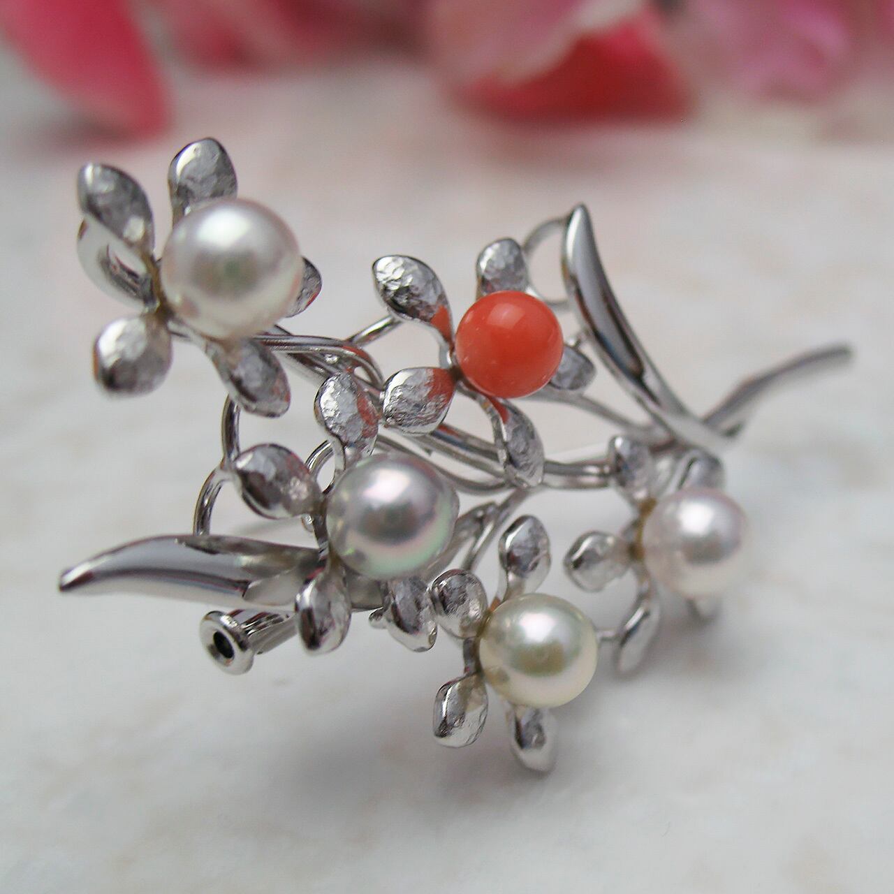 今回はあこや真珠ナチュラルと珊瑚を使って仕上げてみました