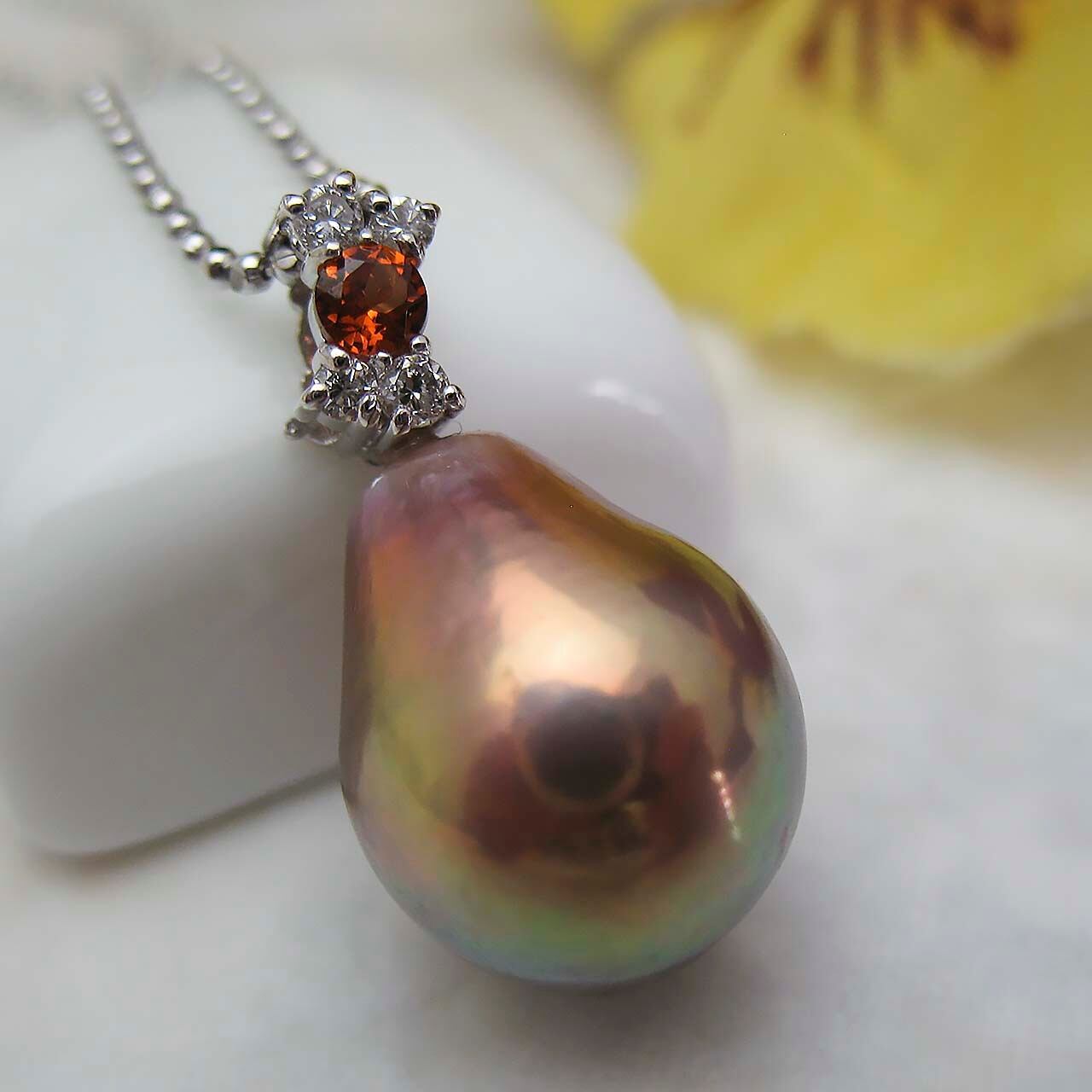 K18WG有核淡水真珠 天然色・スぺサルタイトガーネットペンダント